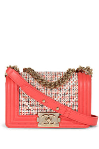 • Pink, white and black tweed with chevron-patterned faux pearl embellishments, featuring pink lambskin trim and with gold-tone CC turn lock.