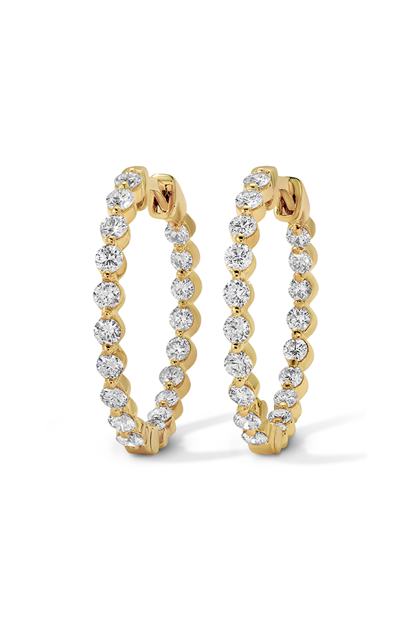 - 14k yellow gold hoops set with round lab-grown diamonds and oval shape drop.