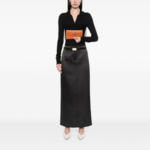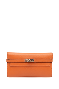 - This Kelly wallet features an Epsom leather body in Orange color, a front flap with turn lock closure, and interior zip and slip pockets.
