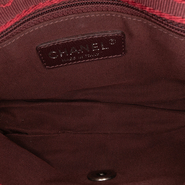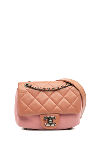 - This flap bag features a quilted leather and felt body, a leather-woven chain strap with leather shoulder guard, a front flap with CC turn lock closure, an exterior back slip pocket, and an interior zip pocket.